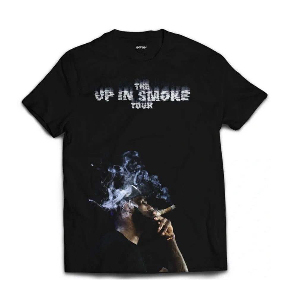 Turn heads with this bold statement piece from HAWDD. The “Up In Smoke Tour” LeBron Tee features a striking front graphic of LeBron surrounded by smoke, paired with distorted tour-style text across the chest for a vintage concert merch vibe. Printed on a premium black cotton tee, this shirt blends sports culture, streetwear energy, and iconic imagery into one standout design.